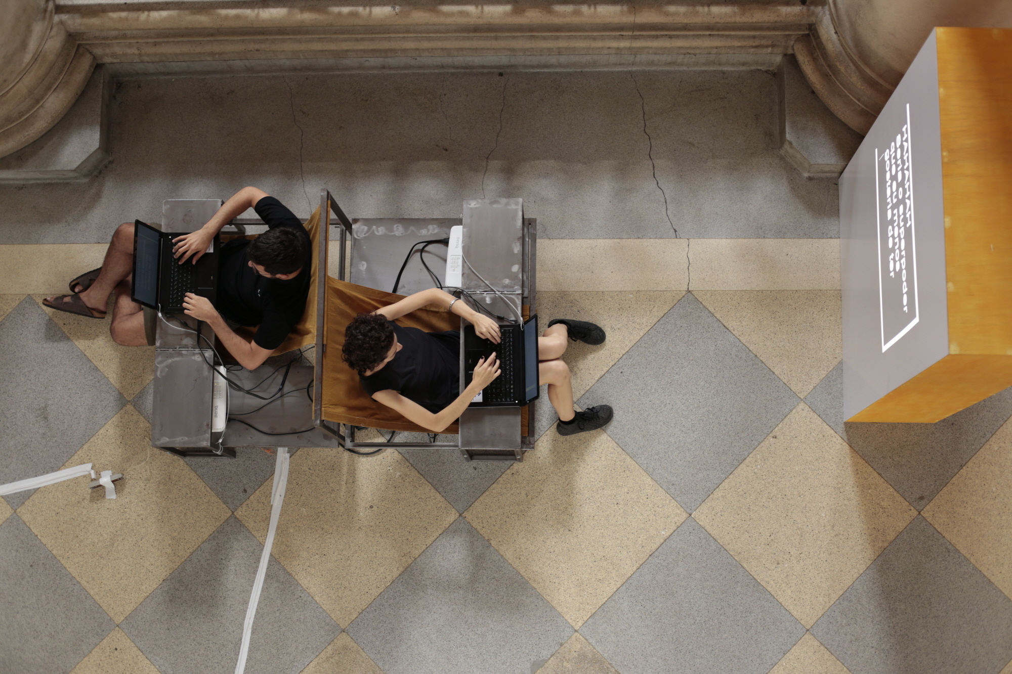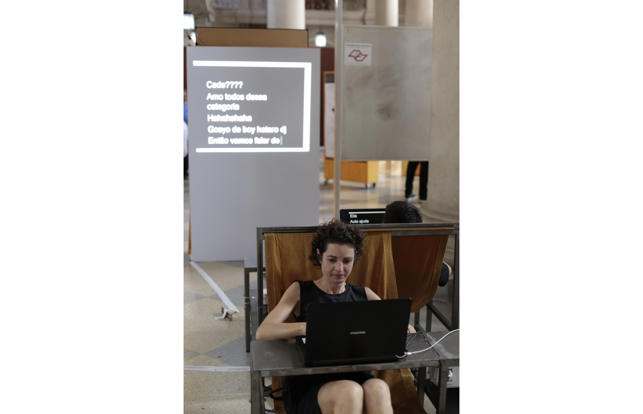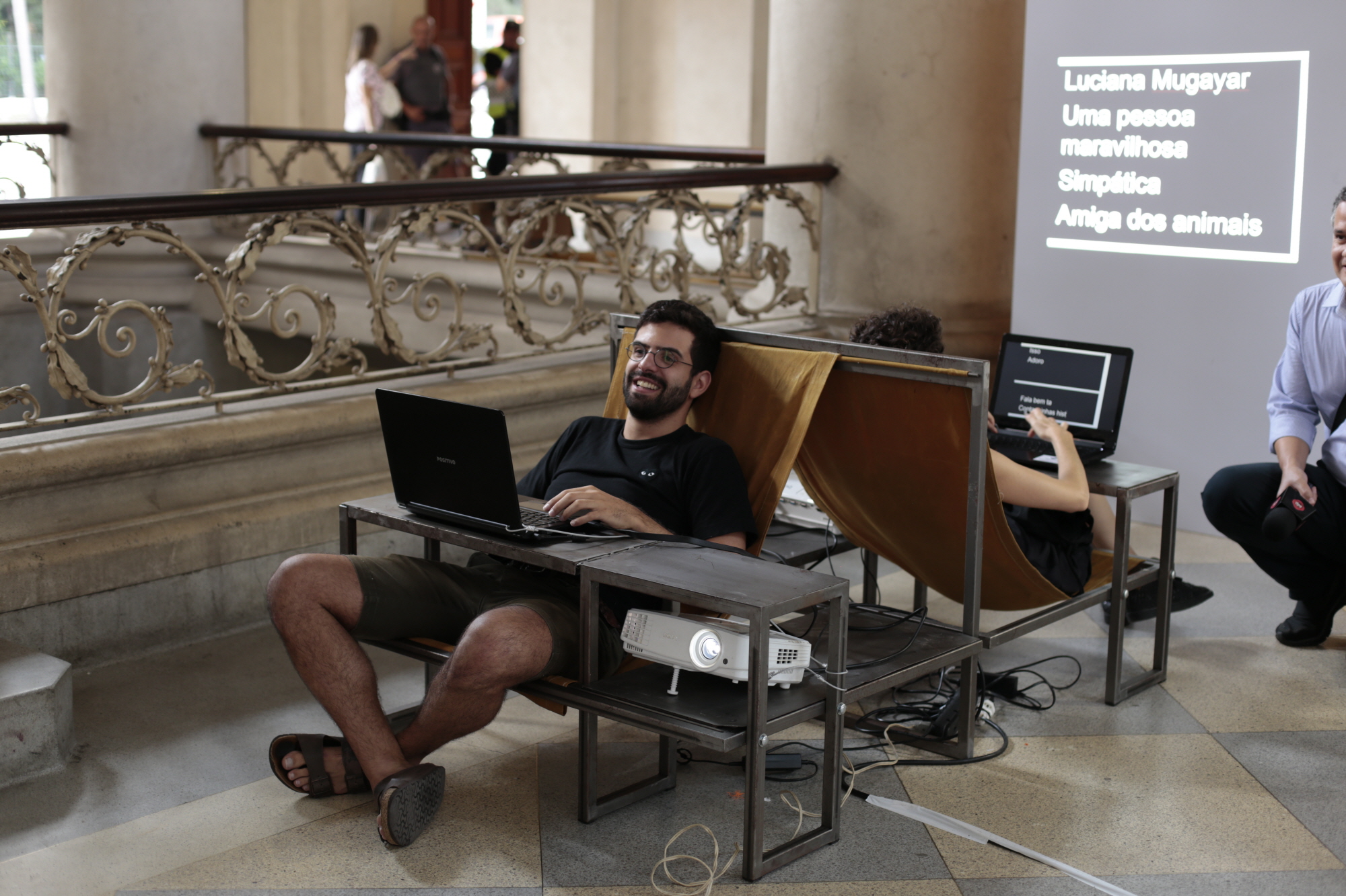 Máquina hipertexto é uma instalação/performance em que duas pessoas que não se conhecem conversam em um chat offline ao vivo, sem se ver. Desse diálogos inusitados registram-se históricos de conversas espontâneas poéticas entre estranhos. O desafio foi construir um móvel leve e transportável que comportasse duas pessoas sentadas de costas uma pra outra, os computadores e projetores do equipamento.